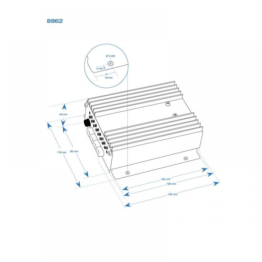 Protected against reversed polarity and overvoltage (transorb diode against transients). Switches off automatically at input voltages over or under the specified range. Fuse at input.