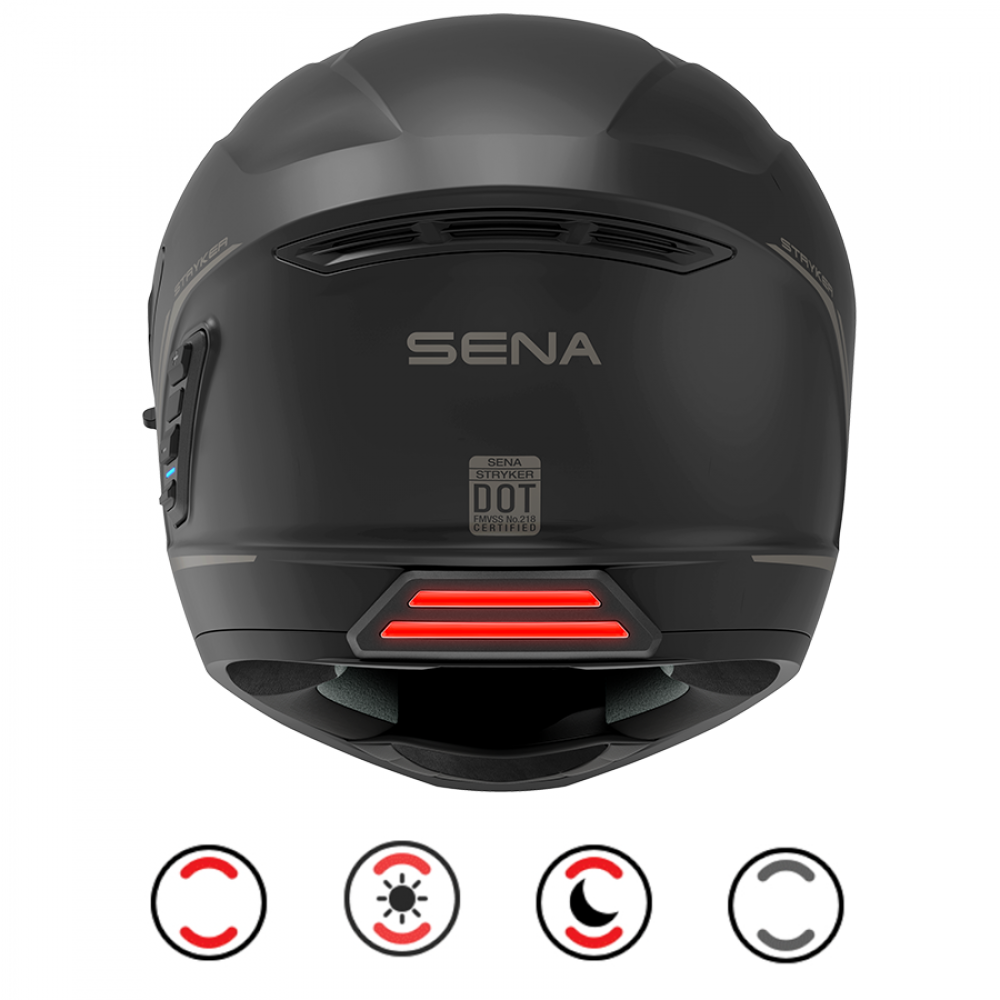 Stryker je dizajniran s mnogo praktičnih značajki, uključujući Senina prva integrirana LED stražnja svjetla za motociklističku kacigu za dodatnu vidljivost vozača. Stryker s oznakom ECE je kaciga koja pokriva cijelo lice s laganom kompozitnom školjkom od stakloplastike. Stryker nudi impresivnih sedam ventilacijskih otvora uključujući otvor za bradu, gornji otvor, dva bočna otvora, kao i tri ispušna otvora. Kaciga ima vizir za sunce koji se može uvući kako bi zaštitio vozače od pretjeranog odsjaja dok su na cesti.